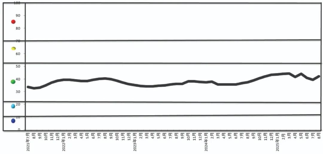中国铜产业月度景气指数监测模型结果显示,2025年8月份,中国铜产业月度景气指数为42.0,较上月上升2.7个百分点,继续保持在“正常”区间运行;先行指数为79.6,较上月下降0.1个百分点;一致指数为78.2,较上月上升4.4个百分点。最近13个月中国铜产业月度景气指数见下表。