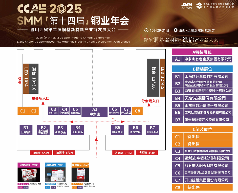 铜业年会攻略合集:参会、考察、运城代表景点一站式指南发表时间:2025-10-21 17:53 2025 SMM铜业年会 本月召开 铜产业人 四面八方,奔赴盛会! 中国·山西·运城 30000+线上流量、600+企业参会代表 扫码报名参会 ![]() 本文目录 会议概况 参会企业名单 展位图&参展企业 会议日程 出行指南 酒店住宿 会后考察 旅游攻略 ![]() 会议概况 会议时间: 2025年10月29-31日 会议地点: 本次会议由中条山集团独家冠名 中条山有色金属集团有限公司(简称中条山集团)成立于1956年,属国家“一五”计划重点项目,是以铜为主、多业并举,集地质勘探、采选冶炼、精深加工、机械制造、建筑建材、国际贸易、科研设计、尾矿综合利用等为一体的中国华北地区最大的铜全产业链企业。先后承担了国家“六五”“七五”“九五”“十五”重点(铜行业)科研攻关项目,是中国铜工业发展的重要孕育地、实践地、技术策源地,2023年成功当选山西省重点产业链“铜基新材料”链主企业。旗下最大控股子公司——北方铜业股份有限公司(简称北方铜业,证券代码000737),于2021年12月在深圳证券交易所成功上市。 中条山集团作为中国重要产铜基地之一,资源储量丰富,现探明保有铜矿石资源储量2.25亿吨、金属量140万吨,矿山深边部远景资源量3.3亿吨,铜金属量250万吨。现主要产品及产能为采矿1050万吨、选矿1150万吨、铜精矿含铜5.5万吨、阴极铜35万吨、高性能压延铜带3万吨、高精度压延铜箔5000吨、金锭15吨、银锭275吨,水泥150万吨、耐磨材料2万吨,同时综合回收铂、钯、硒、碲、铋、铑、铱等有价稀贵金属元素。铜采选、铜冶炼产能稳居中国铜行业前十,连续多年荣登中国有色金属企业营业收入50强。 参会企业名单 参会名单持续更新中 上下滑动查看全部 ![]() 扫码报名参会 ![]() 展位图&参展企业 展位图 ![]() 参展企业名录 A1 中条山有色金属集团有限公司 B1 上海靖升金属材料有限公司 B2 宝鸡市亚钛新金属有限公司/陕西亚钛电极科技股份有限公司 B3 西安泰金新能科技股份有限公司 B4 天合光能股份有限公司 B5 山东恒邦冶炼股份有限公司 B6 宝鸡钛普锐斯钛阳极科技有限公司 B7 阳光新能源开发股份有限公司 C3 张家口宣化华泰矿冶机械有限公司 C4 运城市中泰胶辊有限公司 C5 祁县宏大耐火材料有限公司 C6 宝鸡瑞恒华钛金属复合新材有限公司 C7 开山控股集团股份有限公司 ![]() 会议日程 日程总览 13:30-17:00 签到&展商布展进场&观展 13:30-17:00 2025铜产业供需交流会 17:50-20:00 自助晚餐 09:00-09:20 开幕式及致辞 09:20-12:00 主论坛:2025SMM(第十四届)铜业年会 13:30-17:00 论坛二:铜基新材料重点应用论坛 13:30-17:00 论坛三:铜产业低碳能源转型论坛 15:00-17:00 运城市招商推介会 18:00-20:00 “中条山之夜”招待晚宴 09:00-15:30 企业考察(矿山、冶炼厂、产业园) 日程详情&会议议题 2025/10/29 论坛一:金属矿冶智造与应用发展论坛 13:30-14:00 铜矿产业现状与绿色转型路径 发言嘉宾: 魏迎辉 中条山有色金属集团有限公司 董事长 14:00-14:30 铜冶炼技术革命:从规模驱动到绿色智能跃迁 发言嘉宾: 何 峰 中国瑞林工程技术股份有限公司 副总经理 14:30-15:00 AI新能源产业中的铜材应用 发言嘉宾: 潘建锋 浙江花园新能源股份有限公司 董事长 15:00-15:30 精废铜杆的应用领域市场变迁 拟邀嘉宾: 施学青 江苏亨通精工金属材料有限公司 总经理 15:30-16:30 再生阳极铜在铜冶炼原料结构优化中的关键作用 发言嘉宾: 姜善誉 上海有色网信息科技股份有限公司 高级分析师 孙武军 中条山有色金属集团有限公司 部长 拟邀嘉宾: 郑元文 江西新越新型材料集团有限公司 销售总经理 李 军 赤峰金通铜业有限公司 副总经理 冯旭辉 安徽拓美威铜业集团有限公司 副总经理 16:30-17:00 技·数驱动,贸·融结合,助力有色产业新生态 发言嘉宾: 董 諶 上海有色网金属交易中心有限公司 董事长 2025/10/30 主论坛:2025 SMM(第十四届)铜业年会 09:00-09:20 开幕致辞 发言嘉宾: 康 义 中国有色金属工业协会 原会长 张 铭 上海期货交易所 副总经理 魏迎辉 中条山有色金属集团有限公司 董事长 卢嘉龙 上海有色网信息科技股份有限公司 CEO 山西省工业和信息化厅、运城市工业和信息化局、运城经济开发区 09:20-09:45 2025全球铜产业链供需格局与价格预测 发言嘉宾: 叶建华 上海有色网信息科技股份有限公司 大数据总监 09:45-10:10 中国铜矿资源战略与海外投资风险应对 发言嘉宾: 朱 清 中国地质大学 教授 10:10-10:30 中国铜工业“十五五”高质量发展战略思考 发言嘉宾: 康 义 中国有色金属工业协会 原会长 10:30-10:50 零碳园区解决方案助力铜行业绿色低碳发展 发言嘉宾: 田 原 阳光新能源开发股份有限公司 大客户总经理 10:50-11:00 茶 歇 11:00-12:00 圆桌访谈:铜产业破局:资源、技术与市场的三重挑战 1)资源困局:稀缺性加剧与结构失衡 2)技术瓶颈:绿色转型与高端突破的双重压力 3)市场重构:定价权缺失与需求结构变革 4)中国破局三维战略 5)全球对标与风险预警 发言嘉宾: 李 烨 上海靖升金属材料有限公司 总裁助理 吕 勇 北方铜业股份有限公司 副总经理 拟邀嘉宾: 王华星 中铝洛阳铜加工有限公司 副总经理 郭学益 中南大学 教授 12:00-13:30 自助午餐 2025/10/30 论坛二:铜基新材料重点应用论坛 13:30-14:00 连接器用高性能铜合金的生产 发言嘉宾: 韩卫光 山西北铜新材料科技